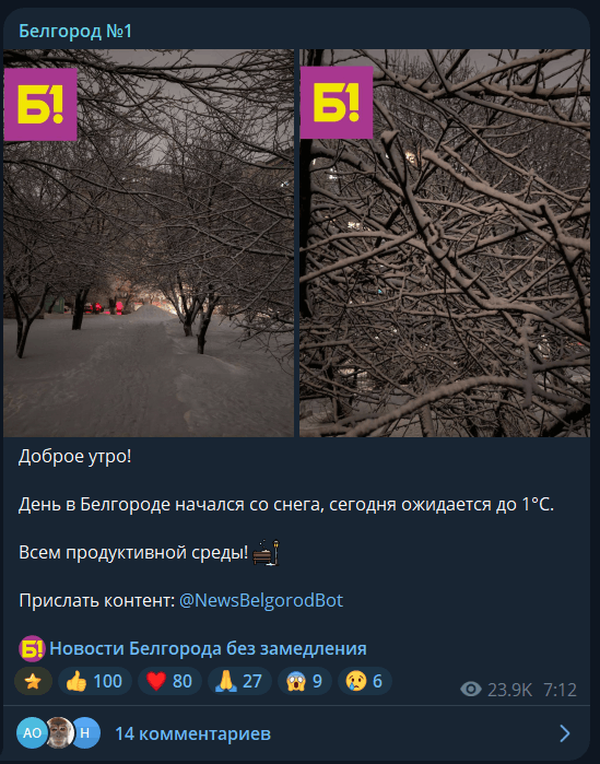 Контент — не просто пересказ новостей. Есть свои рубрики, читатели сами присылают фото и истории через бот канала, работают социальные проекты — например, помогают искать потерянных животных. Когда спрашивают обратную связь, читатели отвечают неожиданно: